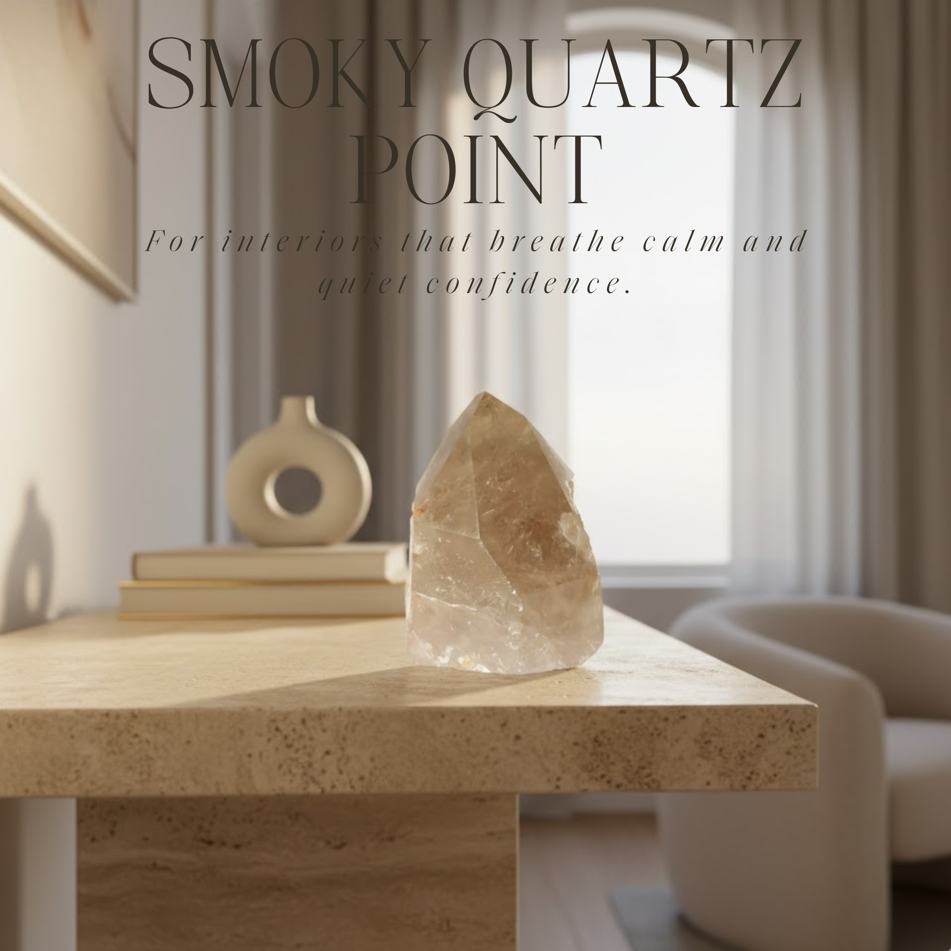 Deze gepolijste rookkwartspunt heeft zacht gelaagde banden in rijke grijstinten. Subtiel en rustgevend.